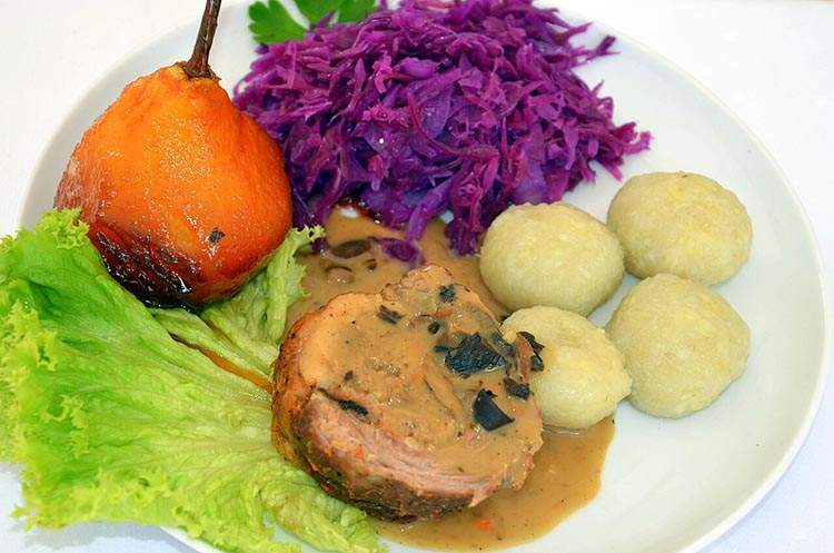 Na zdjęciu: potrawa kuchni śląskiej: Rolady, kluski śląskie i modra kapusta / foto: Silar / cc by-sa 3.0