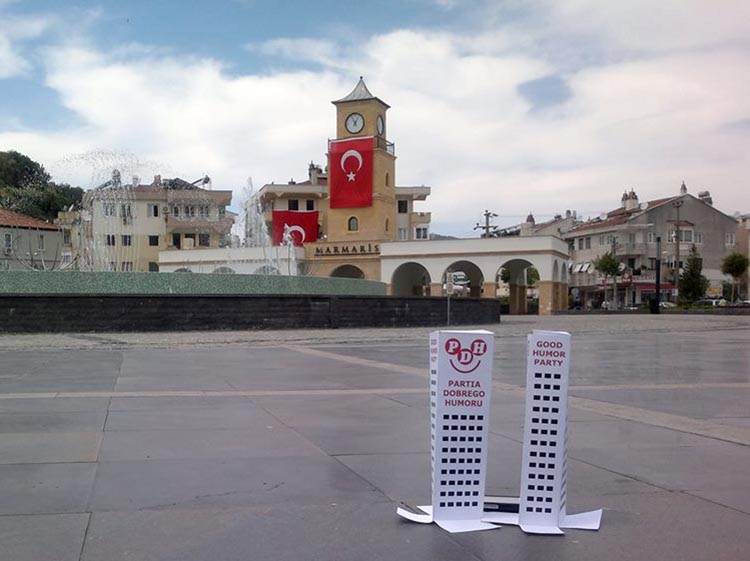 Zapraszamy kolejne osoby do udziału w naszej zabawie – wystarczy skleić „wieżowca” i sfotografować go w kolejnym miejscu świata (w zamian, oprócz satysfakcji: legitymacja Partii Dobrego Humoru oraz specjalny Certyfikat.